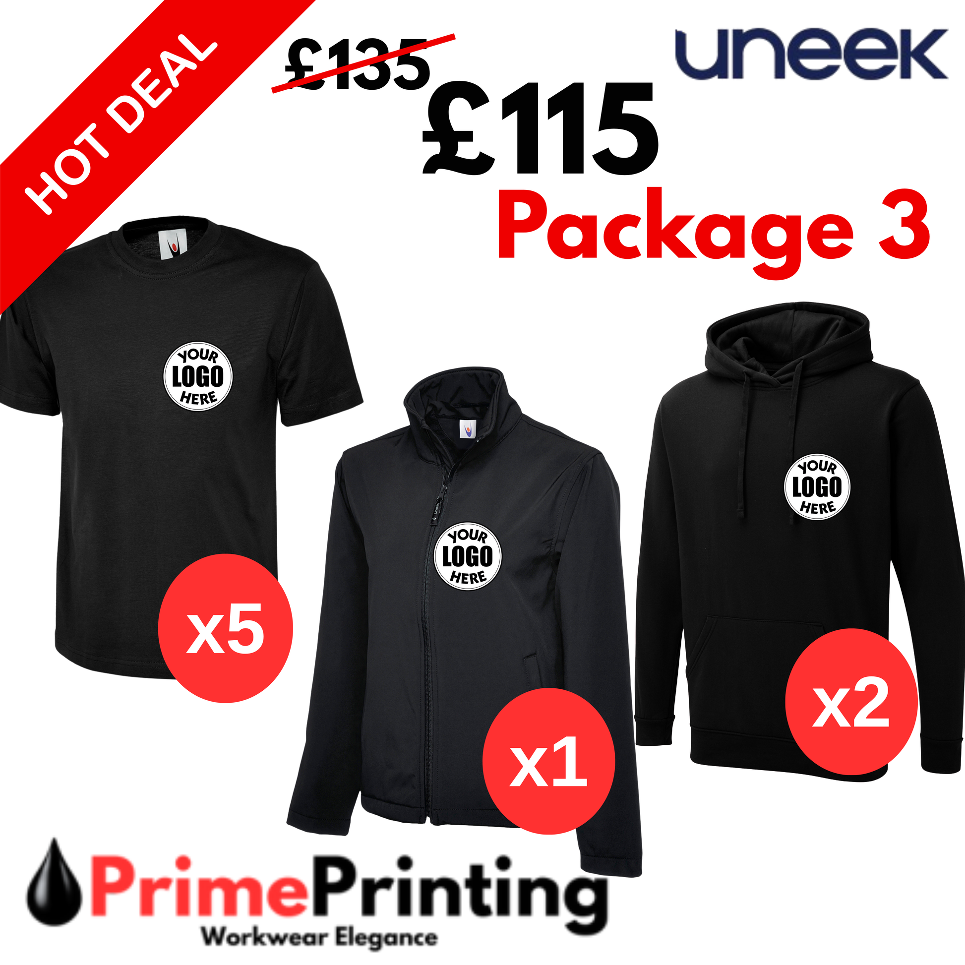 Refresh your team’s look with our best-value bundle! Package 3 includes 1 Softshell Jacket, 5 premium T-Shirts and 2 cosy Hoodies, all customised with your logo. Perfect for small businesses, start-ups, or anyone looking to upgrade their workwear at an unbeatable price.